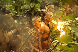 Не мога да кажа доколко са успели да пресъздадат обществото на маите автентично. Но поне са се постарали. Индианците преливат от татуировки и пиърсинг, има и епично изглеждащ град на маите със стъпаловидна пирамида, говорят на някакъв странен език... По никакъв начин не можеш да кажеш, че са карали просто на аналогии и малко боя. И въпреки това на моменти това изглежда прекалено. Имам предвид, хубаво, диваци са, но нека не всеки кадър крещи това.