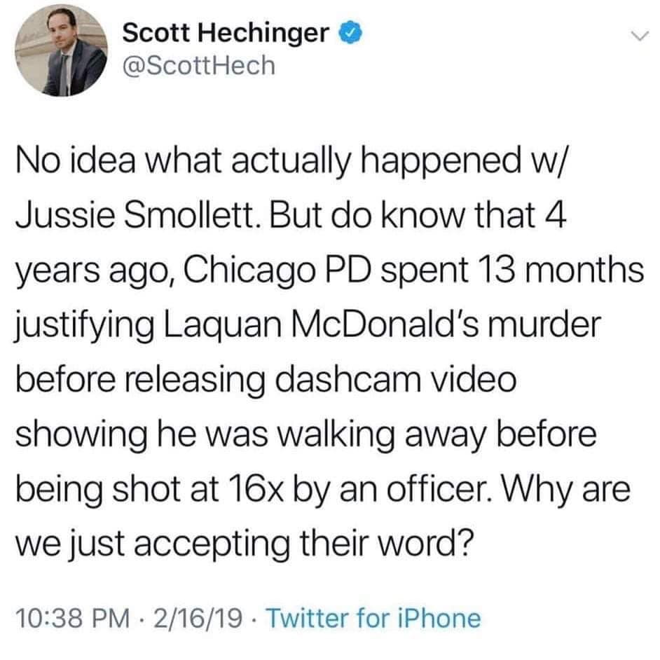 Друг е въпросът колко е лицемерно точно човек в неговото положение да вземе точно такъв адвокат. Нали актьорът е чернокож гей, защо наема бял хетеро тежкар от хората на Тръмп да го защитава? В Чикаго все ще има някой и друг чернокож адвокат, или пък бял гей адвокат, или поне някоя добра и доказана жена адвокатка? Нали говорим за солидарност – защо този актьор, твърдящ, че е жертва на расизъм и хомофобия, не даде тласък на кариерата на чернокож или гей адвокат, който ще го защитава със сърце, а отива при скъпарските хетеро бели защитници на Тръмп? Лицемерие.
