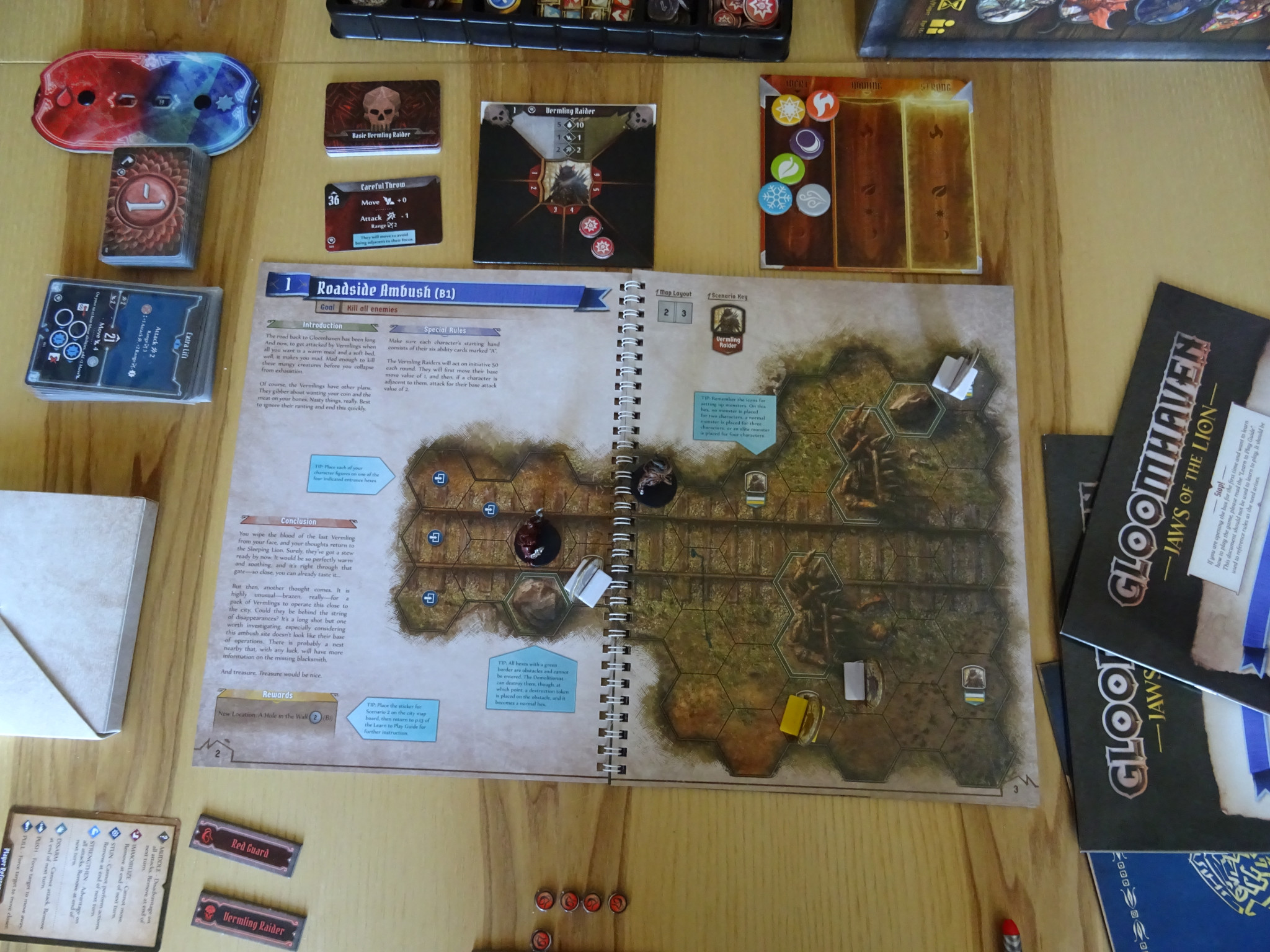 Наравно с наистина прекрасно разработените въвеждащи сценарии, Gloomhaven: Jaws of the Lion има още един елемент, сочен за страхотна оптимизация спрямо оригинала. Докато в първата игра всеки сценарий изисква немалко време търсене на елементи от терена и сглобяване, то в Jaws of the Lion сценариите са предварително отпечатани в специална книга и сетъпът за игра ви е буквално пет минути – колкото да отворите на правилната страница и да наредите чудовищата. Това е още една причина „малкото братче“ да е толкова подходящо за въвеждане в света на Gloomhaven, без тежката логистика да ви убива удоволствието.