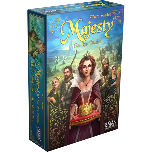 В Majesty играчите влизат в ролята на благородници, които се борят за овакантения престол. Това става чрез привличането на различни жители и разпределянето им по съответните локации/сгради, което носи точки и ни приближава до заветната цел. Играта продължава 12 рунда и накрая събралият най-много точки печели короната. По подобие на повечето евро-игри и тук темата би могла да е всякаква, но благодарение на красивите илюстрации и факта, че картите със сгради образуват една панорамна картина, се получава доста прилично потапяне в средновековното кралство. Splendor печелеше много почитатели с изчистения си дизайн и Марк Андре се е постарал не просто да го запази, но и да го издигне до нови висини. В Majesty реално имате само едно действие, което правите всеки ход – избирате си една от наличните 6 карти с жители и я слагате под съответната сграда. Толкова. Звучи изключително елементарно и на пръв поглед наистина е така, но само след 2-3 хода ще установите, че реалността е по-различна. Само първата карта (т.е. тази, която е най-далече от тестето) е безплатна. За да вземете някоя от останалите, трябва да поставите на предходната работник. Т.е., втората ще ви струва 1 работник, четвъртата карта ще ви струва 3 работника, петата – 4 и пр. Може много да ви трябва рицарят на пета позиция, но поради недостиг на работници да не можете да си го позволите. Работниците са лимитирани до 5 на играч и когато поради дадено действие получите допълнителни над тази бройка, сте длъжни в края на хода си да ги смените за по 1 точка всеки. Доста хитро използване на механиката с подправките в Century, но с добавени точки. Всъщност манипулациите на работниците са добър начин за трупане на екстра точки в хода на играта. Това коя от картите ще изберете, определя не само точките, които получавате вие, но доста често може да носи точки и за останалите играчи (поставяне на пивовар в пивоварната например носи точки и за всеки, който има мелничари, ханджията дава точки за пивоварите и т.н.).