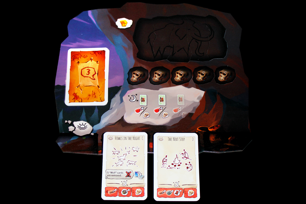 Paleo попада и в двете категории, но в нея вместо геймплеят да се накъсва с четене на епизоди и взимане на решения, историята се разгръща пред играчите на базата на първия описан метод – посредством тяхното собствено интерпретиране на случващото се. Например след преодоляването на една от картите с опасност получавате копие. Но ако се загледате в заглавието и илюстрацията на картата, може да си представите как групата ви е нападната от освирепял отшелник и след като го побеждавате, взимате копието му. Самото условие за победа, завършването на пещерната рисунка, е една метафора за оцеляването на племето във времето и препятствията, през които то е преминало. Един от любимите ми примери е картата „Howls in the Night„, или „Вой в нощта„, която има на илюстрацията си пет вълка и изисква всяка нощ да даваме ресурси или капан, за да не умре някой от племето. Тези елементи доста ясно описват, че в околностите има глутница вълци, които нападат хората всяка нощ. Но ако играчите успеят да премахнат пет карти с вълци, то те могат да се отърват тази карта, което е просто начин играта да ни разкаже, че сме успели да изловим тези вълци и те вече не тероризират племето.